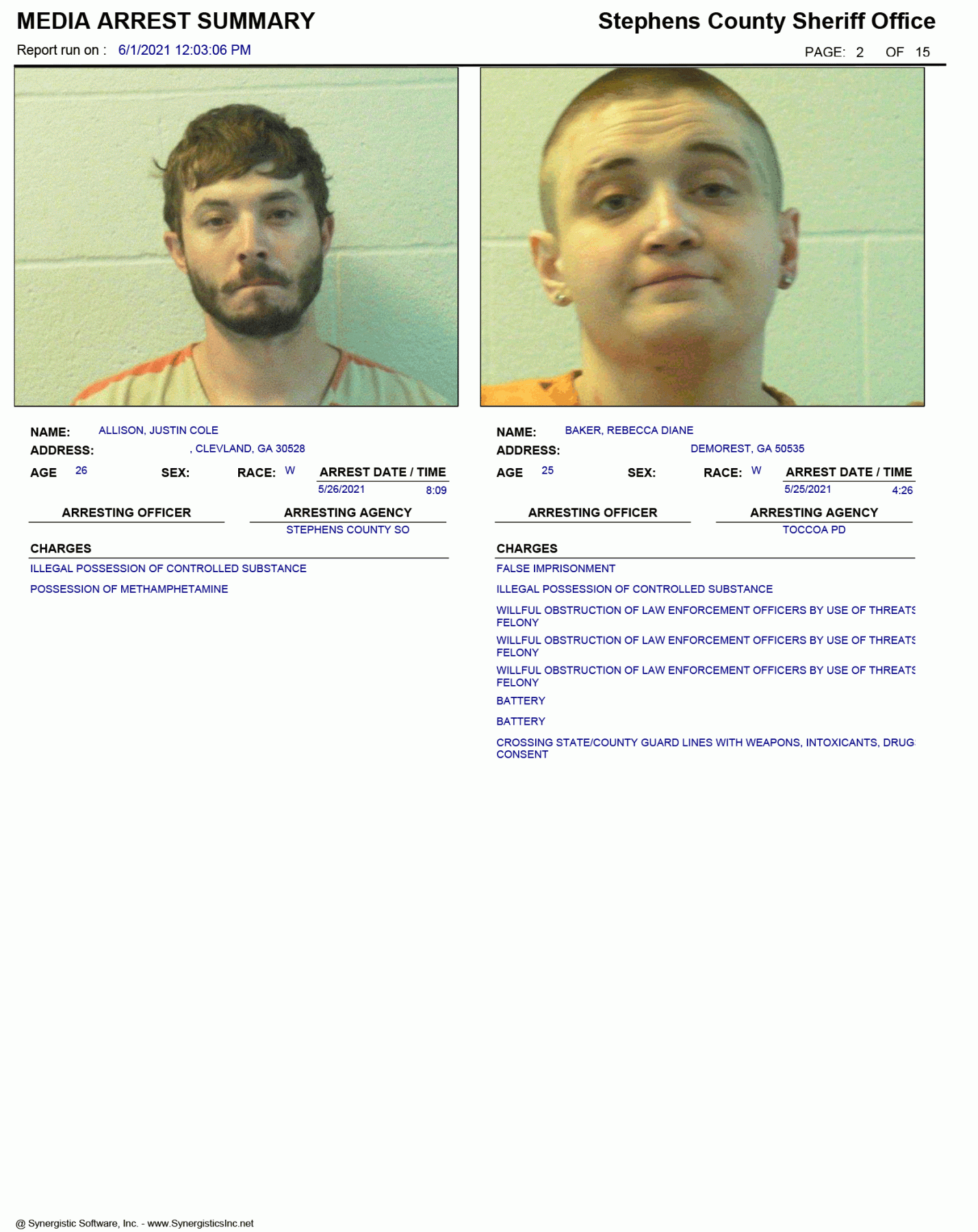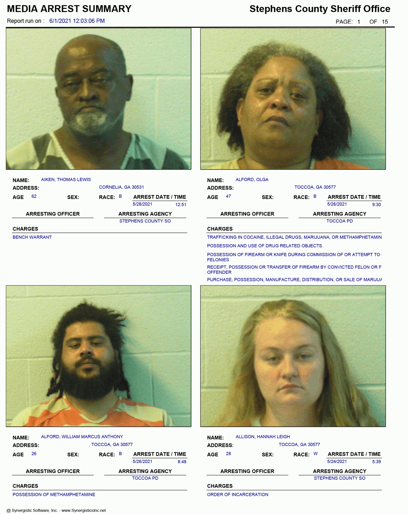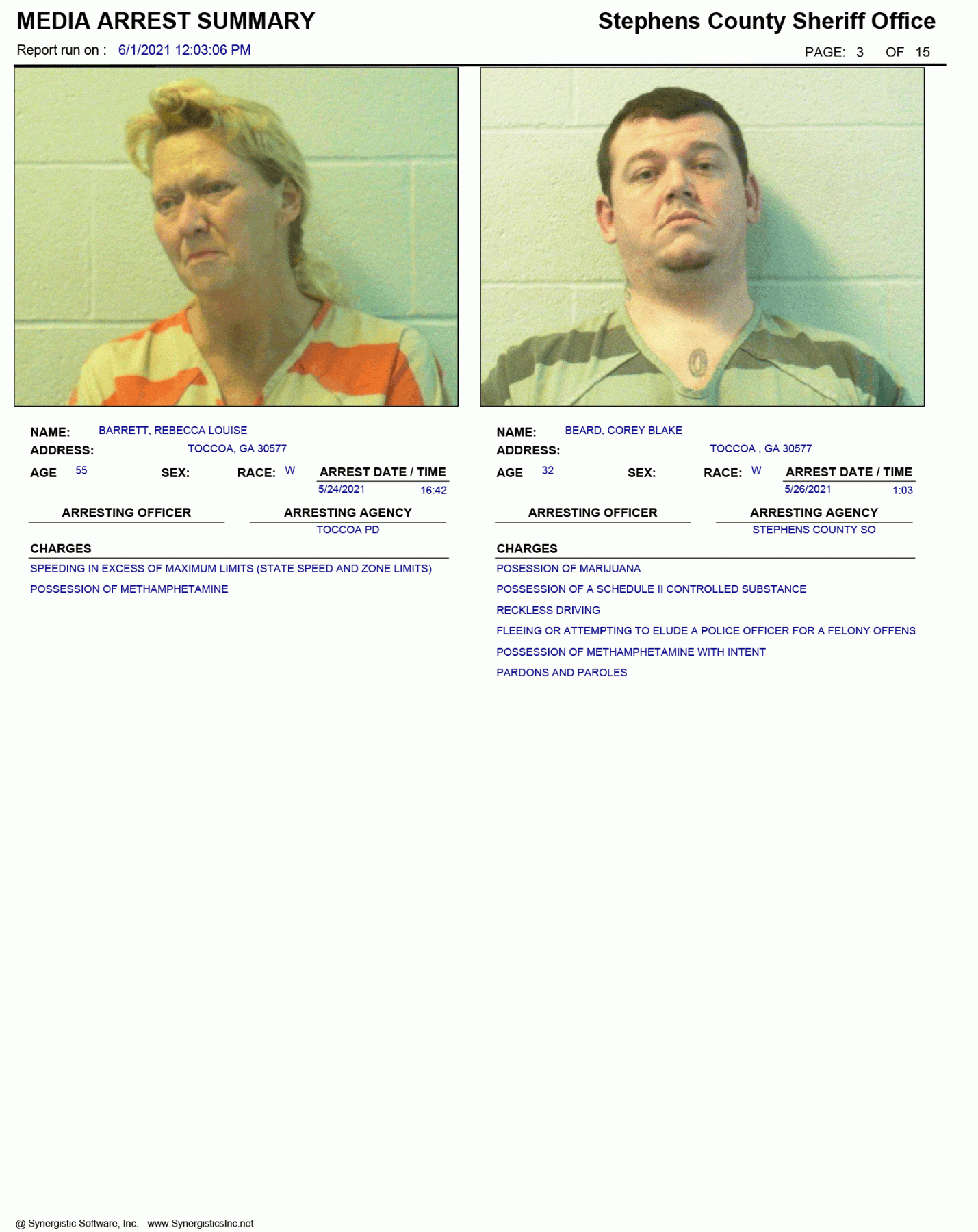 The Georgia Open Records Act (O.C.G.A. 50-18-70) allows for FetchYourNews.com to obtain and post the arrest records/booking report of any and all individuals arrested in Stephens County. Those arrests are posted on FetchYourNews.com for viewing pleasure. Please remember that all individuals listed have been arrested and charged, however, they are presumed innocent until guilt has been proven in a court of law. FYN publishes the arrest report provided by the SCSO.